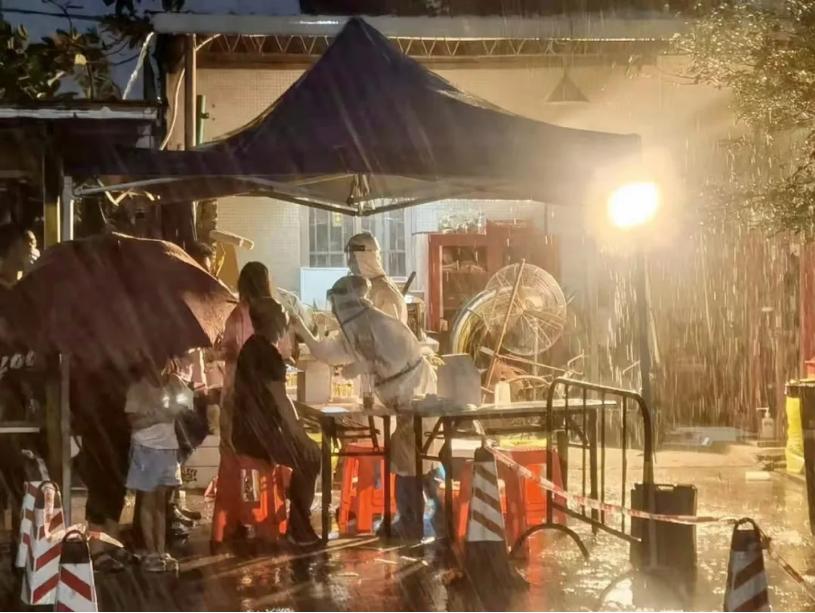 倾盆大雨,不仅困住了上班族,也给核酸检测工作增加了难度。