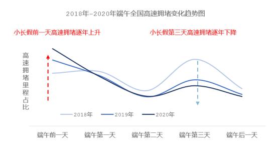 据统计,2018年至2020年,端午假期全国高速拥堵里程呈逐年下降的趋势,而端午假期前一天的全国高速拥堵里程占比却逐年上升。可见,小长假公众错峰出行习惯已初步养成。