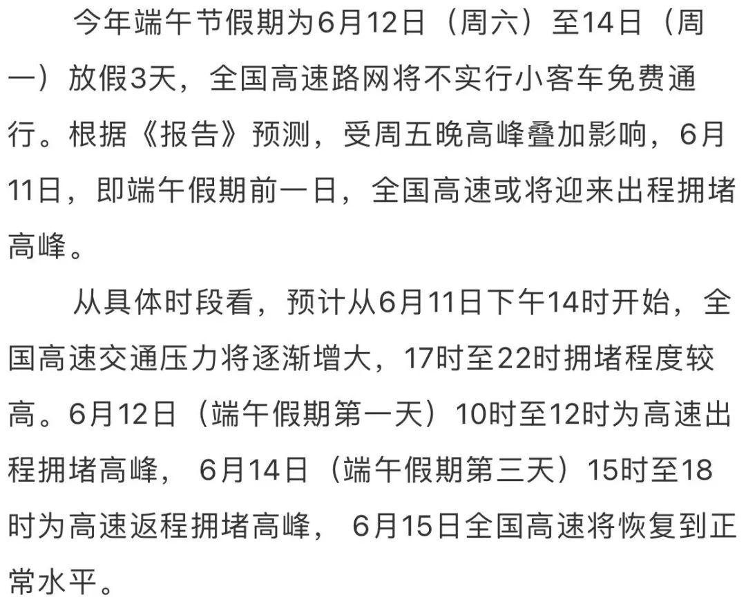 返程中,预计6月14日全国高速返程较易拥堵的路段包括G3京台高速合肥段、 G15沈海高速南通段及S49新扬高速扬州段。端午期间全国高速的交通压力会低于清明、五一假期。