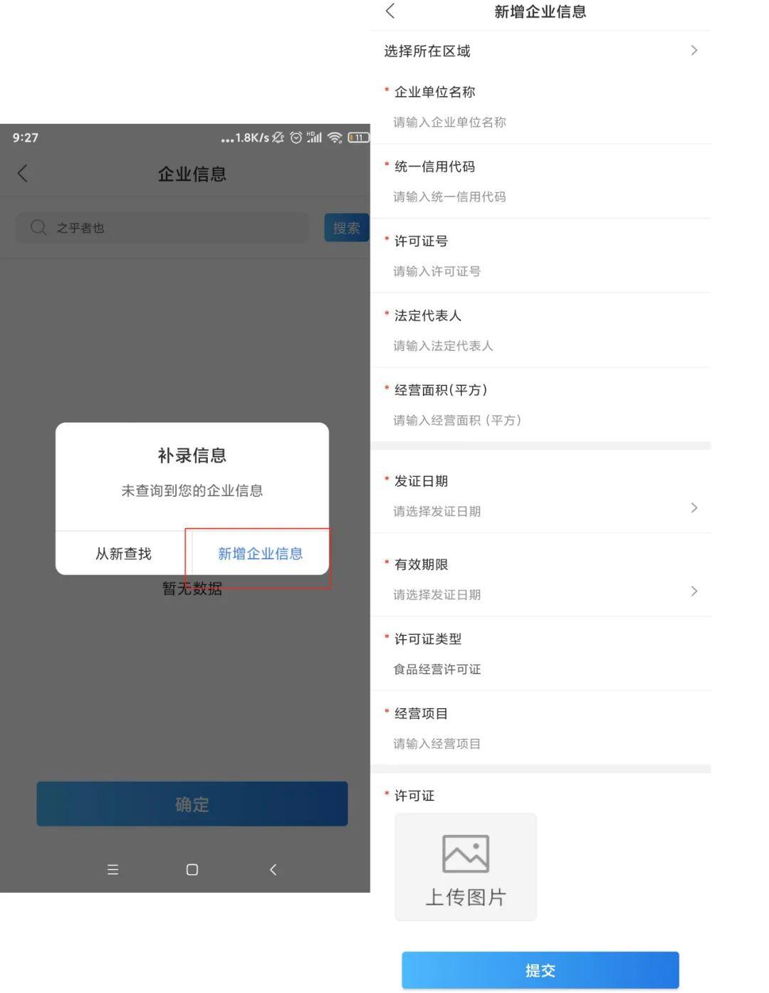 注意:如果食品经营许可证为近期新办,在系统中搜不到个人所在单位,点击“新增企业信息”,输入完整的企业信息提交后,再继续注册即可。
