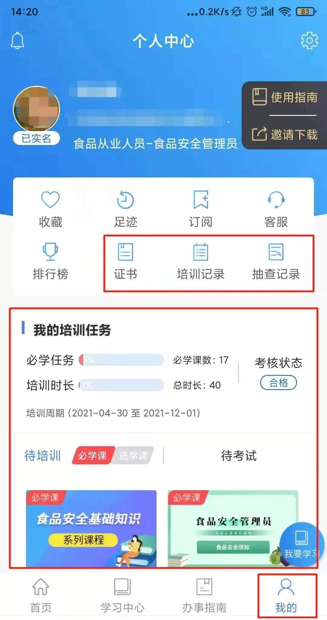 在【我的】页面,用户可看到本人年度培训任务、考核任务、培训记录以及取得考试合格证书。