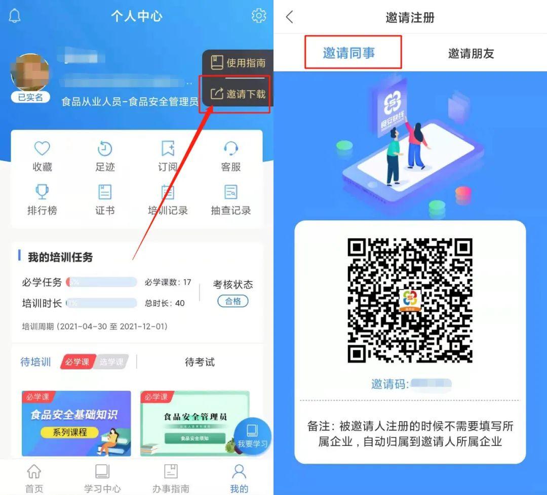 已注册用户在【我的】-【设置】页面,点击【邀请注册】,新注册从业人员打开“食安快线通用版”APP,点击【首页】左上角“扫一扫”,或者在注册页面手动输入邀请码。