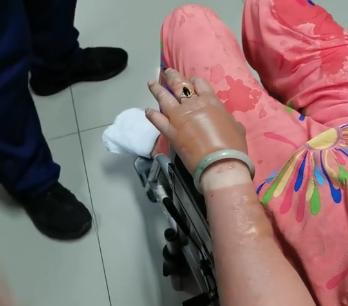 5月23日晚,阜阳市一医院烧伤科求助消防,原来一位女子手部被烧伤后戒指卡住。消防员经其家人同意后,将两个戒指和手镯逐个剪切取下,女子得以接受进一步治疗。