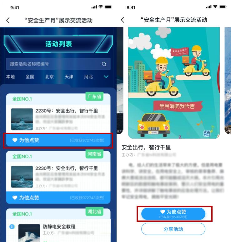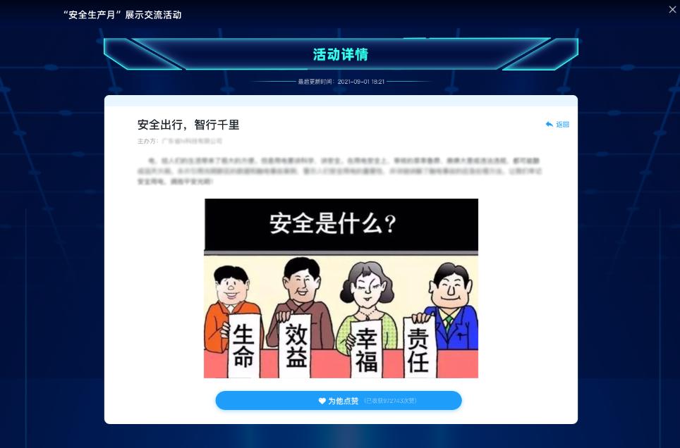 各地区、各有关单位可以通过全国安全生产月官网及“学习强安”App上传2021年“安全生产月”期间开展的线上线下宣教活动,由全国网民通过“学习强安”App对喜爱的活动点赞。