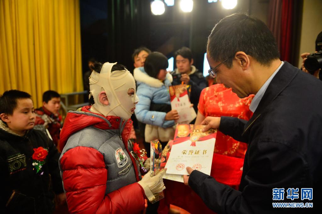 因面对不幸时表现出的勇敢和自强不息,周涛获得江西省“三友”自强少年称号(2015年1月11日摄)。新华社记者周密摄