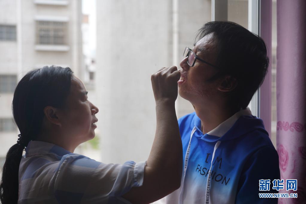 周涛的妈妈给周涛上药。升入高中后,周涛经常脱掉面具学习生活,他也不再因为露出脸部而紧张(2020年4月30日摄)。新华社记者周密摄