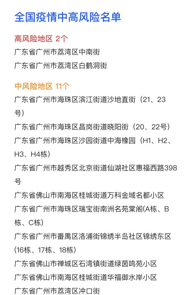 海珠区沙园街道中海橡园(H1、H2、H3、H4栋)、昌岗街道晓阳街(20、22号),以及滨江街道沙地直街(21、23号)由低风险地区调整为中风险地区。