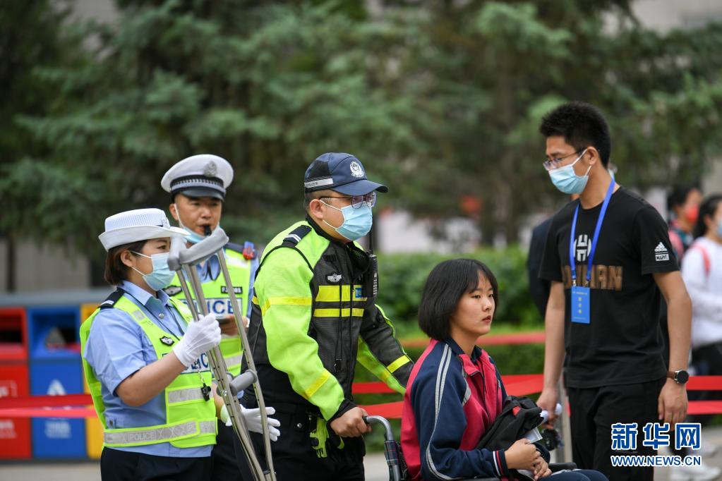 6月7日,交警帮助行动不便的考生进入内蒙古呼和浩特市第二中学(西校区)考点。新华社记者贝赫摄