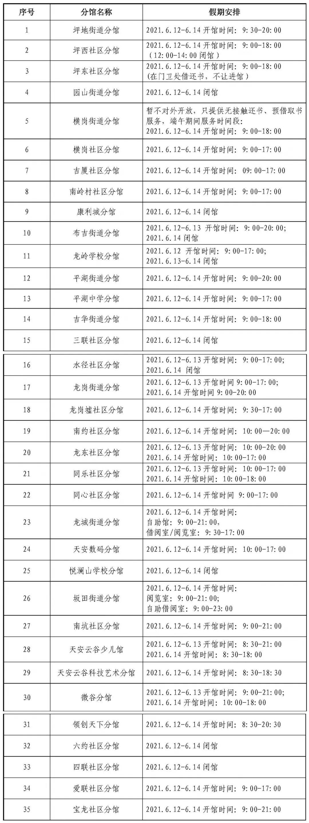 依据《国务院办公厅关于2021年部分节假日安排的通知》并根据各分馆实际情况,现将各分馆端午假期开放时间安排通知如下: