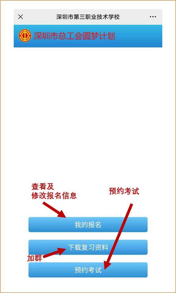 考生可在报名成功后通过“深圳工会”官方微信号进入圆梦计划报名平台预约入学考试,在考试前一个工作日12点之前可修改预约。