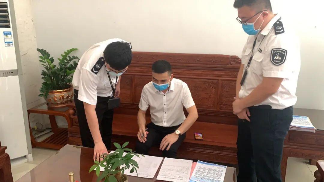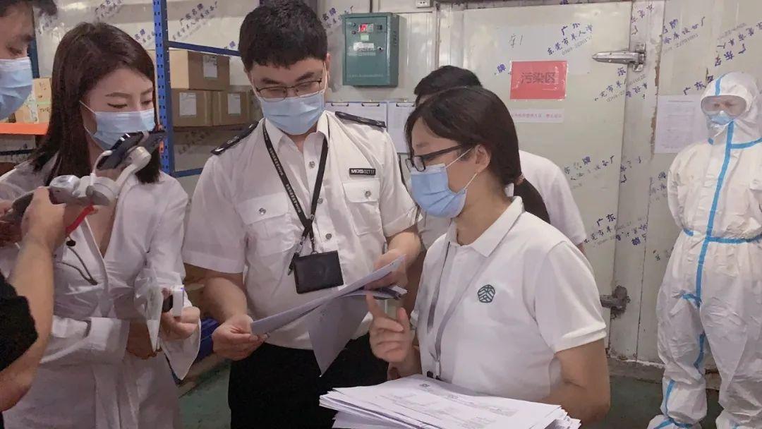 ▲执法人员现场检查进口货物报关单、营业执照和生产经营许可证、核酸检测证明、出入境检验检疫合格证明和消毒证明“三证一单”