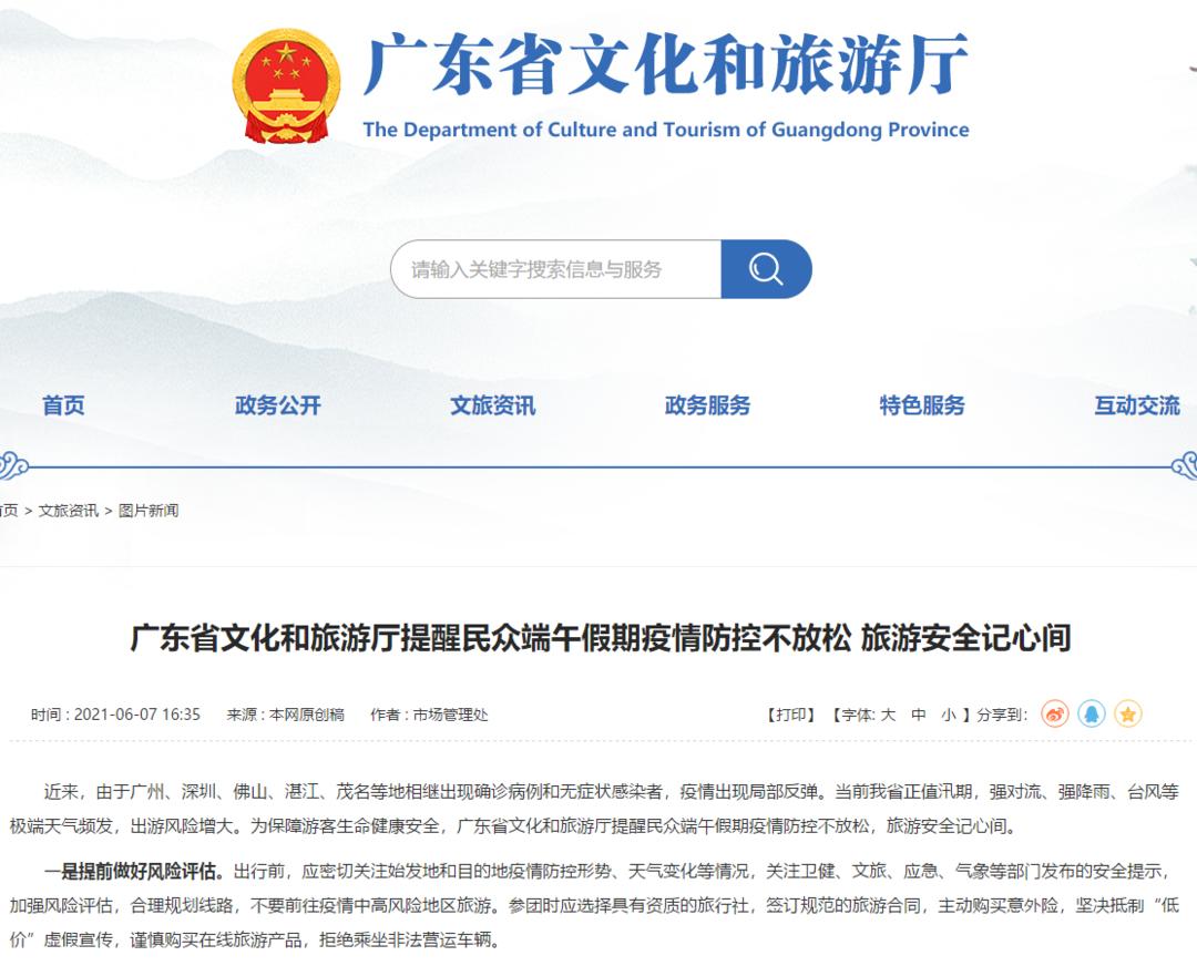 近来,由于广州、深圳、佛山、湛江、茂名等地相继出现确诊病例和无症状感染者,疫情出现局部反弹。当前广东省正值汛期,强对流、强降雨、台风等极端天气频发,出游风险增大。为保障游客生命健康安全,广东省文化和旅游厅提醒民众端午假期疫情防控不放松,旅游安全记心间。