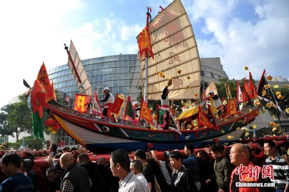 资料图:厦门海沧钟山送王船文化节,当地民众扛着王船游境。中新社记者 张斌 摄