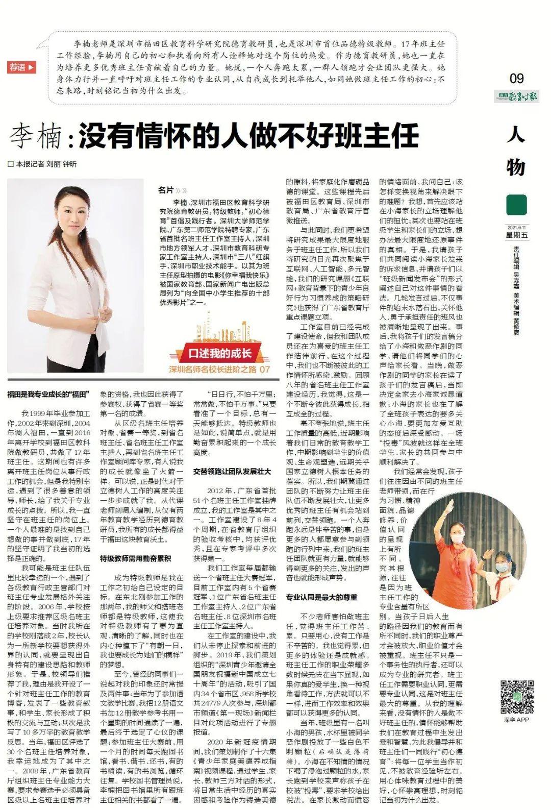 从区级名班主任培养对象、省赛一等奖,到省名班主任、省名班主任工作室主持人,再到省名班主任工作室顾问库专家,有人说我的成长就像坐了火箭一样。可以说,正是时代对于立德树人工作的高度关注一步步成就了我。从代课老师到调入编制,从仅有两年教育教学经历到德育教研员,我所有的成长都得益于福田这块教育沃土。