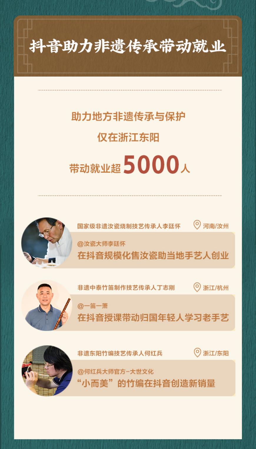 非遗传承人在提高自身收入的同时,也依托抖音电商带动了当地就业。数据显示,仅在浙江东阳一个地区,抖音电商带动非遗相关就业超过5000人。过去一年,国家级非遗代表性项目汝瓷烧制技艺传承人李廷怀,通过抖音电商销售汝瓷超过300万元,带动了当地手艺人创业。