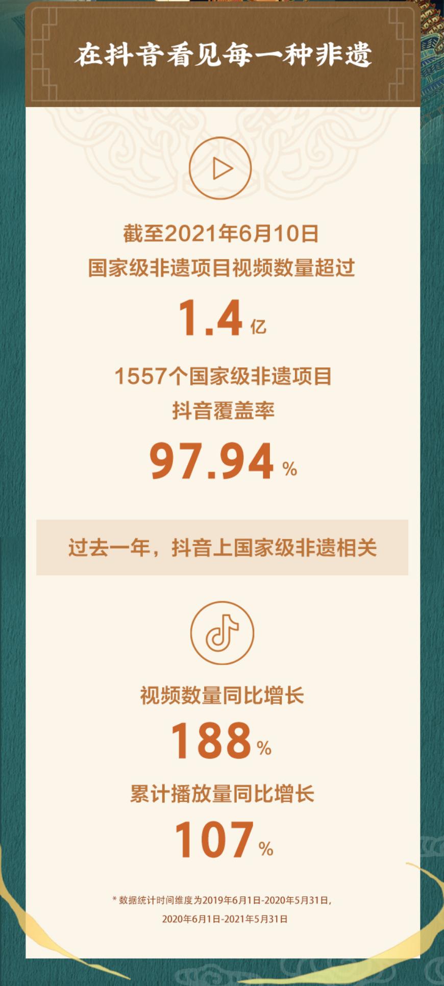6月12日第16个文化和自然遗产日前夕,抖音发布非遗数据报告(以下简称报告)。报告显示,截至2021年6月10日,抖音上国家级非遗项目相关视频数量超过1.4亿;1557个国家级非遗项目,抖音涵盖率达97.94%。