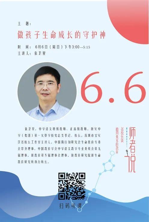 袁卫星,中学语文特级教师、正高级教师,新安中学(集团)第一实验学校党总支书记、校长。深圳市宝安区名校长工作室主持人,中国陶行知研究会生命教育专委会常务理事,中国教育学会中学语文教学专业委员会第九届理事,新教育第五届理事会理事,新教育研究院新生命教育研究所执行所长。