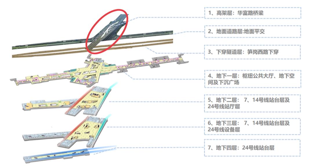 14号线(在建)沿华富路和泥岗西路地下敷设,为地下三层叠侧车站,与既有7号线同台换乘;
