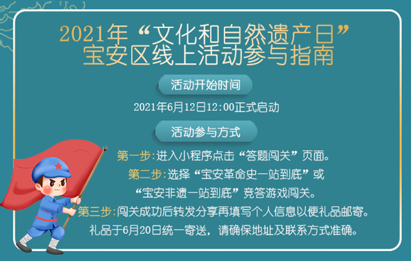 6月12日,由深圳市宝安区文化广电旅游体育局主办的“映耀百年征程传承红色基因”主题活动正式启动,2021年“文化和自然遗产日宝安区线上活动”小程序同步上线,活动持续至6月20日。