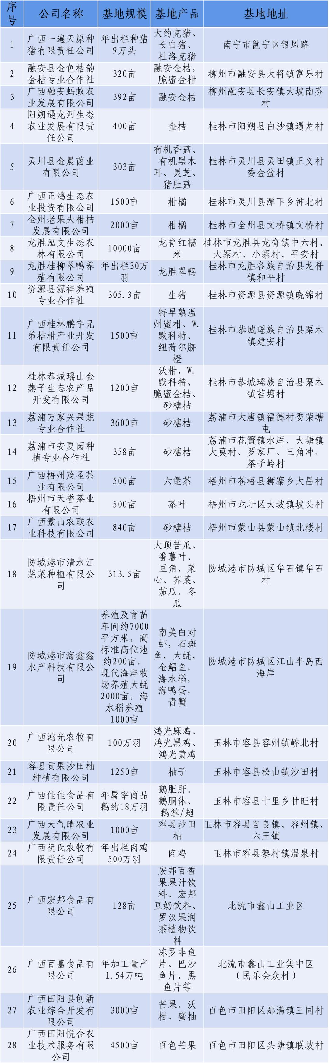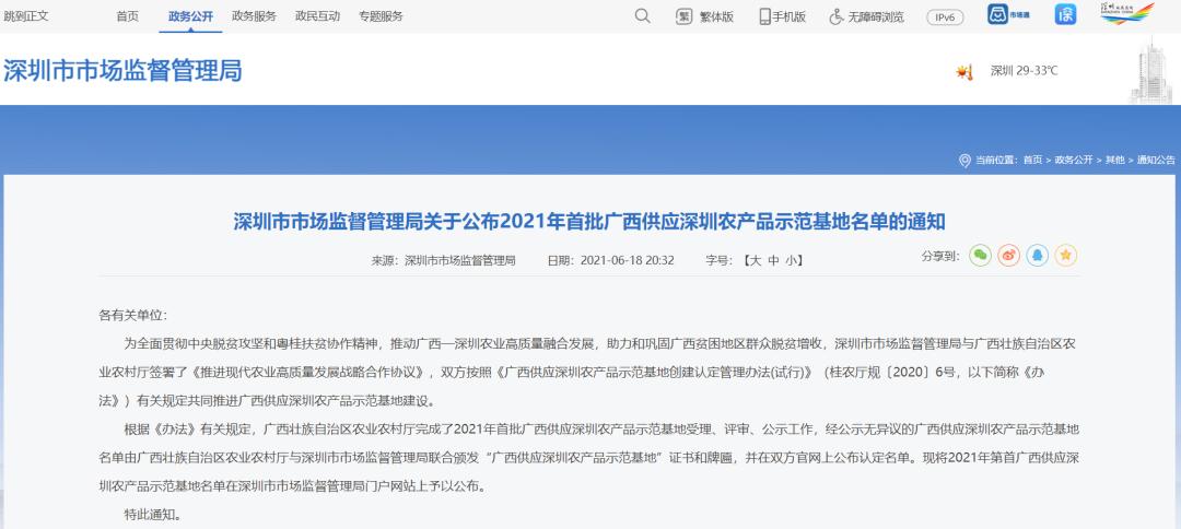 根据《办法》有关规定,广西壮族自治区农业农村厅完成了2021年首批广西供应深圳农产品示范基地受理、评审、公示工作,经公示无异议的广西供应深圳农产品示范基地名单由广西壮族自治区农业农村厅与深圳市市场监督管理局联合颁发“广西供应深圳农产品示范基地”证书和牌匾,并在双方官网上公布认定名单。现将2021年第首广西供应深圳农产品示范基地名单在深圳市市场监督管理局门户网站上予以公布。