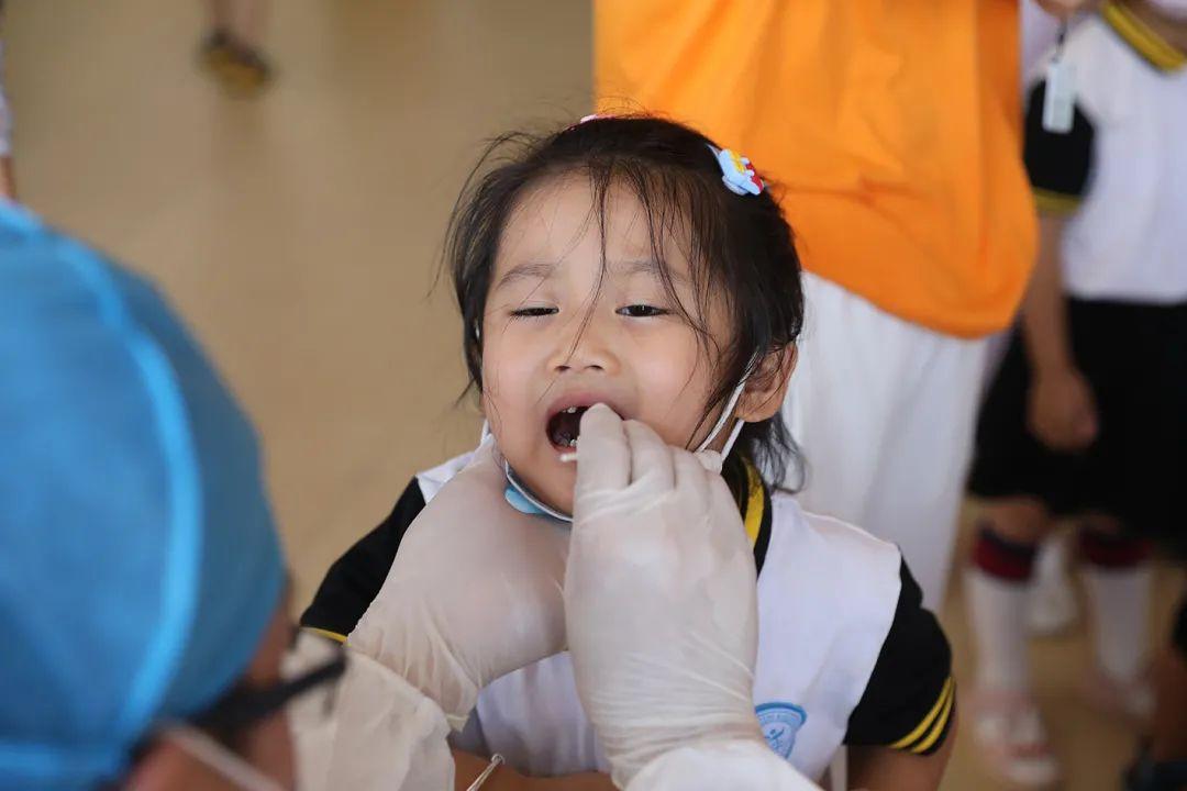 但没过多久,老师就找到了应对的办法。记者注意到,一队小班的孩子始终列着整整齐齐的队伍,乖乖地接受采样。在队伍最前面陪伴他们的,是一位温和可亲的女老师。每个孩子上前后,她就俯身在孩子耳边哄道:“不怕不怕,只是检查一下喉咙,看有没有细菌,很快就好。”一边教孩子张嘴“啊”,一边用手捂住孩子的眼睛。而身穿防护服的医生,就赶紧把准备好的采样棒伸进孩子喉咙里,一噌一刮,迅速完成采样。女老师一边松开手拍拍孩子额头,示意采样结束,一边说着“很棒!很乖”,送孩子退出队伍,又扶着下一个孩子,与信息员核对信息,很快开始新的检测。