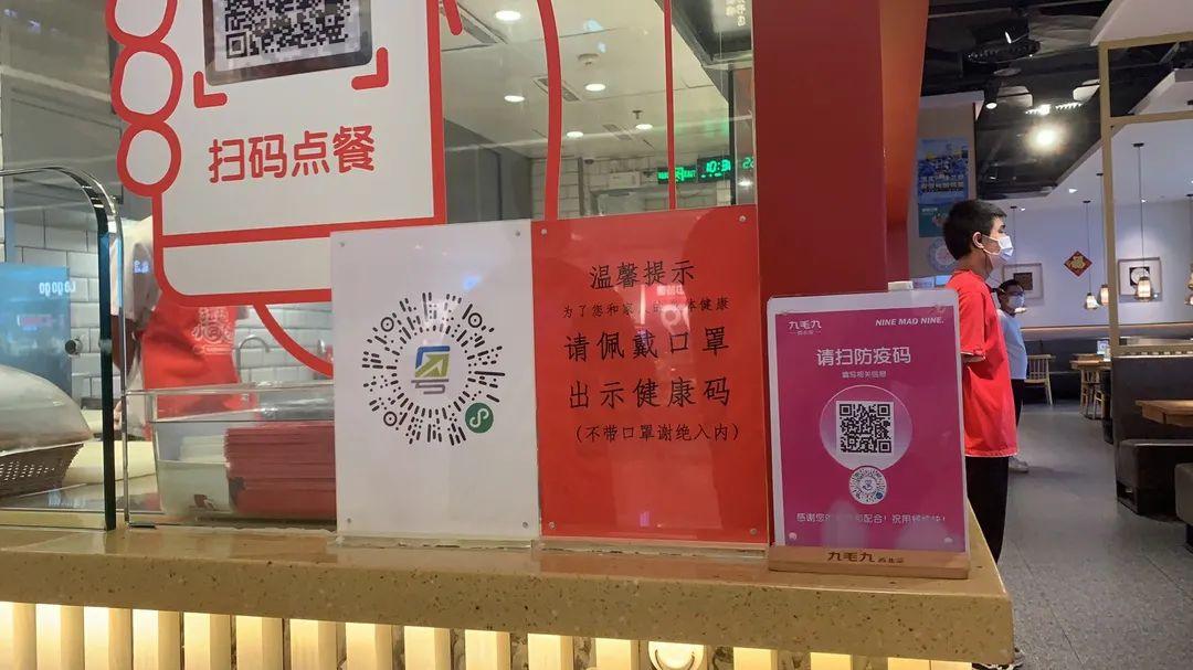 △九毛九餐厅设有防疫提醒,消费者入店需扫描粤康码登记信息,并戴好口罩