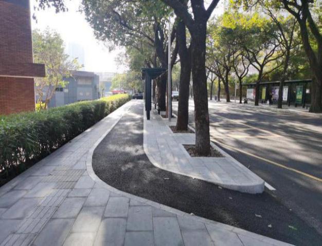 在荔园路的公交站台处,创新打造绕背式非机动车道,消除了公交站台前不同车流交织混行的安全隐患。