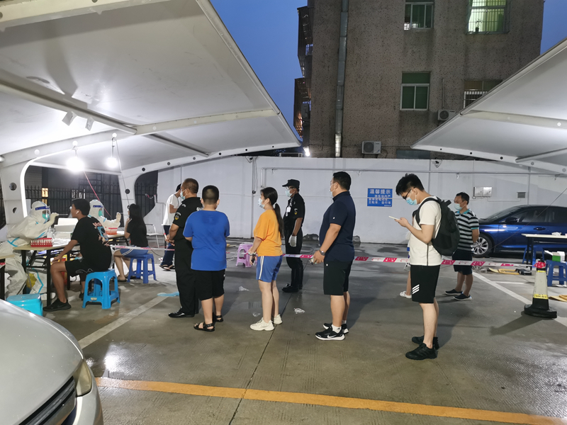 下十围小学考点考务人员和参考学生排队检测核酸。