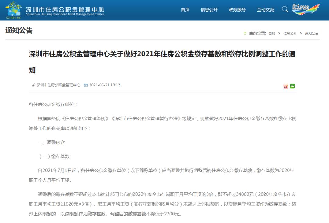 近日,深圳市住房公积金管理中心发出《关于做好2021年住房公积金缴存基数和缴存比例调整工作的通知》。
