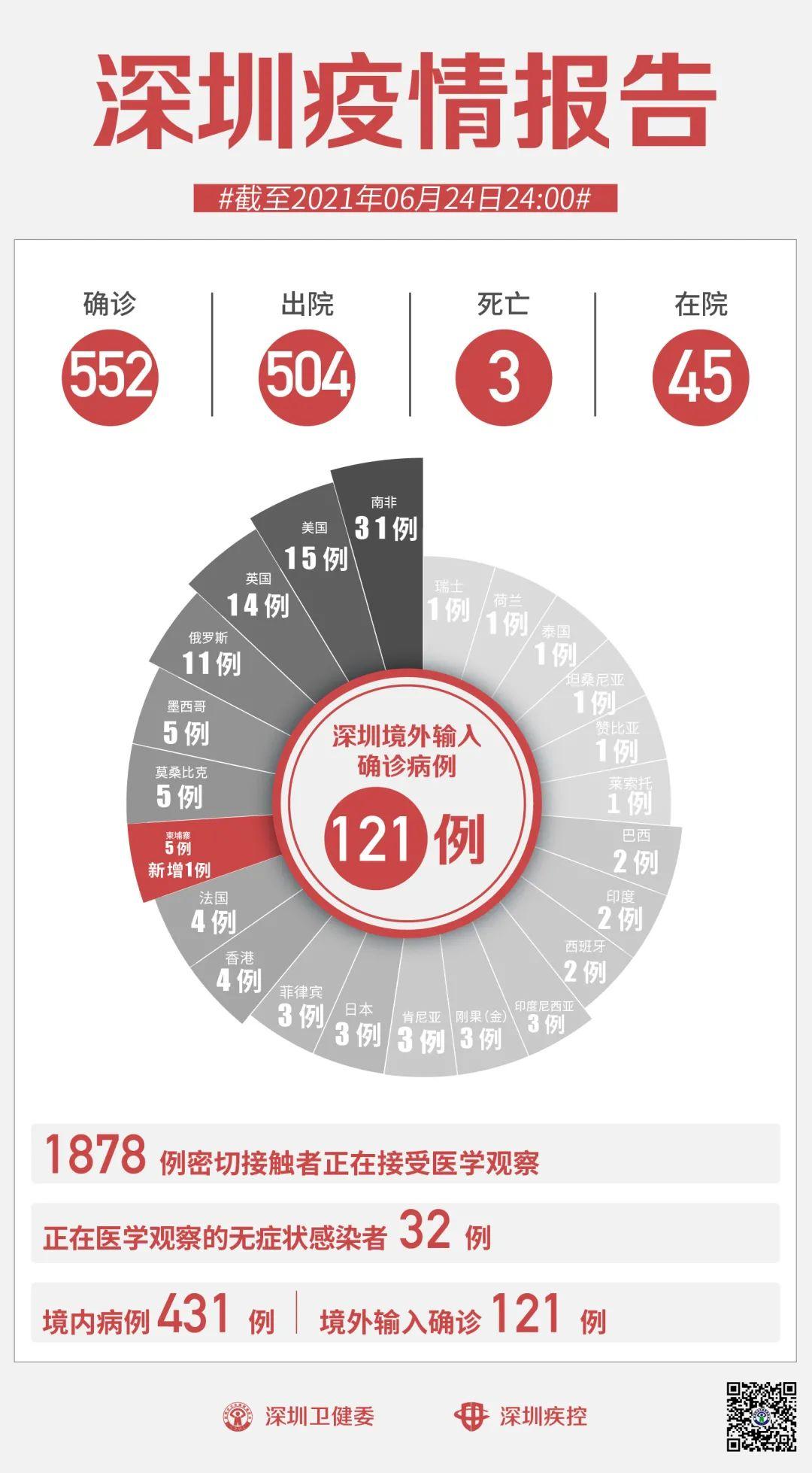 6月24日0-24时,深圳新增1例境外输入确诊病例和2例境外输入无症状感染者。