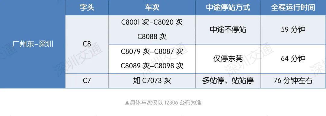 旅客乘坐C8字头(如C8001次)一站式直达列车,广深之间单程仅需59分钟;