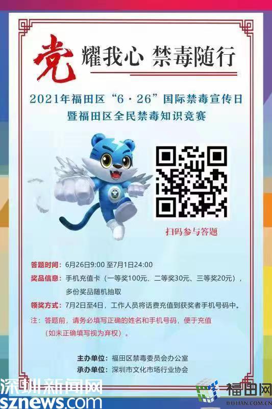 读特客户端·深圳新闻网2021年6月26日讯(记者 黄力雯)按照中央、省市关于禁毒工作的重大决策部署,为结合疫情防控实际,在全社会营造6·26国际禁毒日浓厚的禁毒氛围,增强广大市民识毒、防毒、拒毒意识,在第34个国际禁毒日来临之际,福田区于6月26-7月1日,面向广大市民组织开展了以“党耀我心 禁毒随行”为主题的2021年福田区全民禁毒知识竞赛活动。