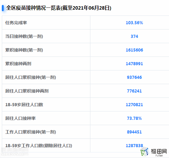 截至2021年6月28日福田区疫苗接种情况一览表。(数据来源:福田区政务服务数据管理局)