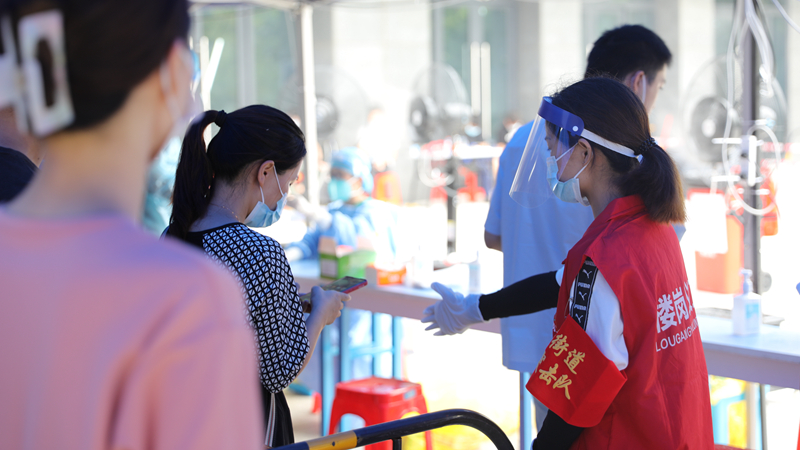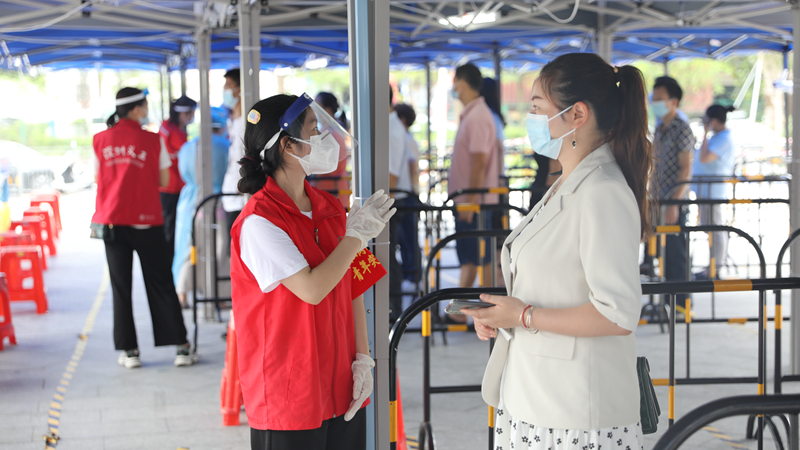 6月23日,在松岗街道楼岗社区汇智百盛花园广场核酸检测现场,醒目的“红马甲”在等候的人群中来回穿梭,井然有序地在现场维持秩序、测量体温、查验行程码、扫描粤康码、协助医护人员开展核酸检测等,保证采样现场队列有序、衔接顺畅。