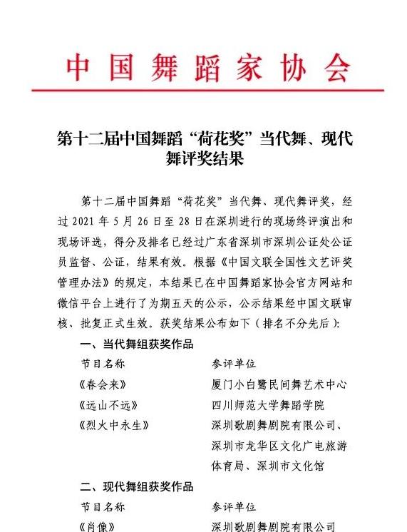 即便如此,深圳歌剧舞剧院选送的当代舞《烈火中永生》、现代舞《肖像》仍脱颖而出,令这个成立仅3年的深圳本土文艺院团在本届“荷花奖”中“双喜临门”,可谓成绩斐然。