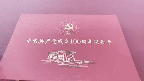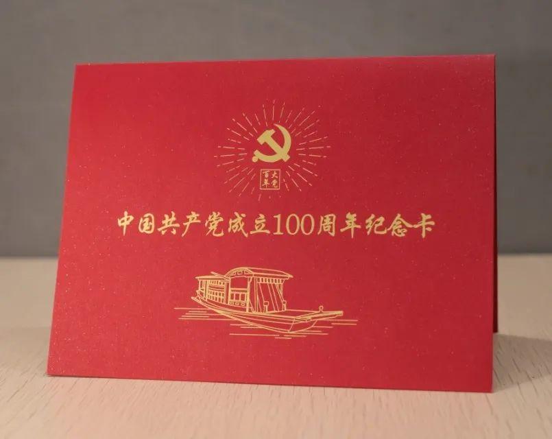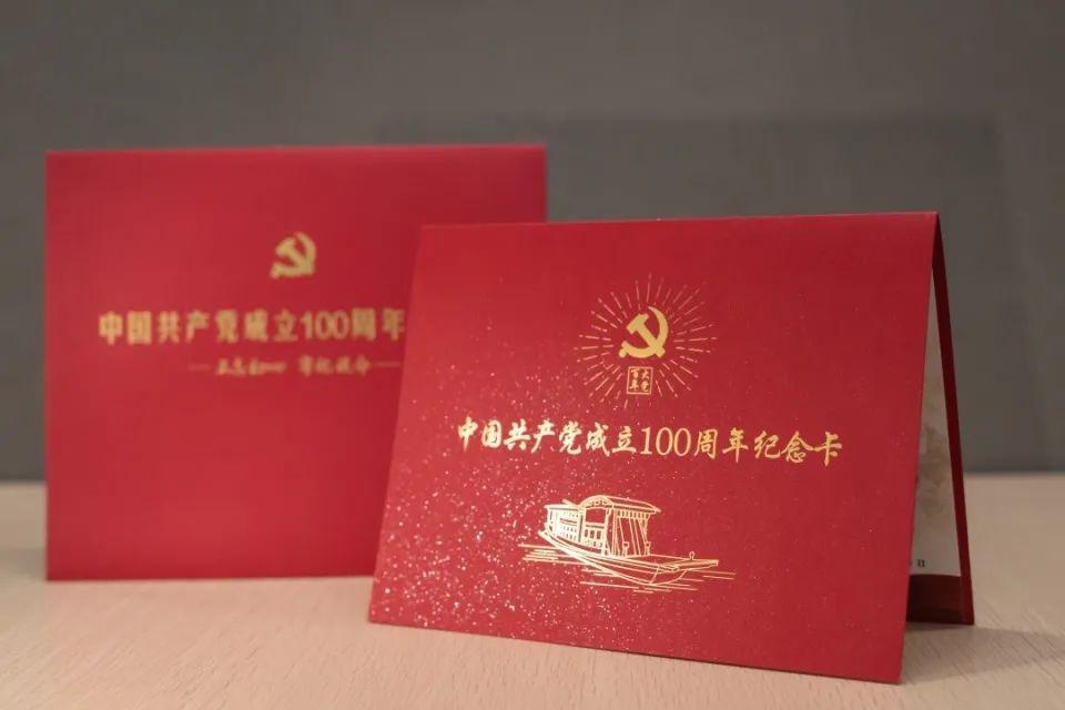 《庆祝中国共产党成立100周年纪念卡》包括信封和纪念卡两部分,均采用特种卡纸制作。党徽、红船图案等多处采用烫红金等特殊工艺。打开内页,含有庄严的入党誓词和充满殷切希望的“七一寄语”。