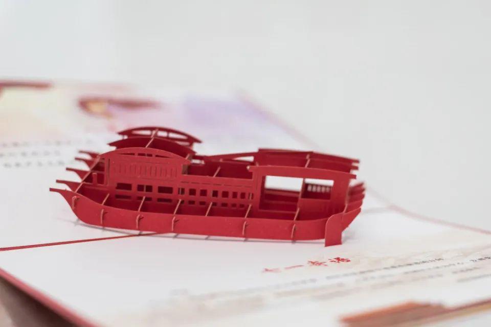 在纪念卡连接处,还特别设计了一艘由13个模切部件,手工拼装而成的南湖红船模型,与封底镂空雕刻的红船相呼应。此次将“红船精神”融入到卡片设计中,也饱含着集团党委激励广大党员追寻一代代共产党人的精神传承,把红色精神转化为推动集团发展的强大动力,转化为干事创业、无私奉献的强大正能量。