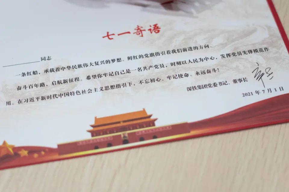 为热烈庆祝中国共产党成立100周年,深圳地铁集团党委创新工作思路,为全体党员精心制作了一份特殊的礼物——《中国共产党成立100周年纪念卡》,旨在增强全体党员的荣誉感、责任感与使命感,激励全体党员做到“不忘初心、牢记使命”,全心全意为人民服务。预计自今日起,4375份精美的纪念卡将陆续送至每一位党员手中,真切感受到组织的关爱和温暖。