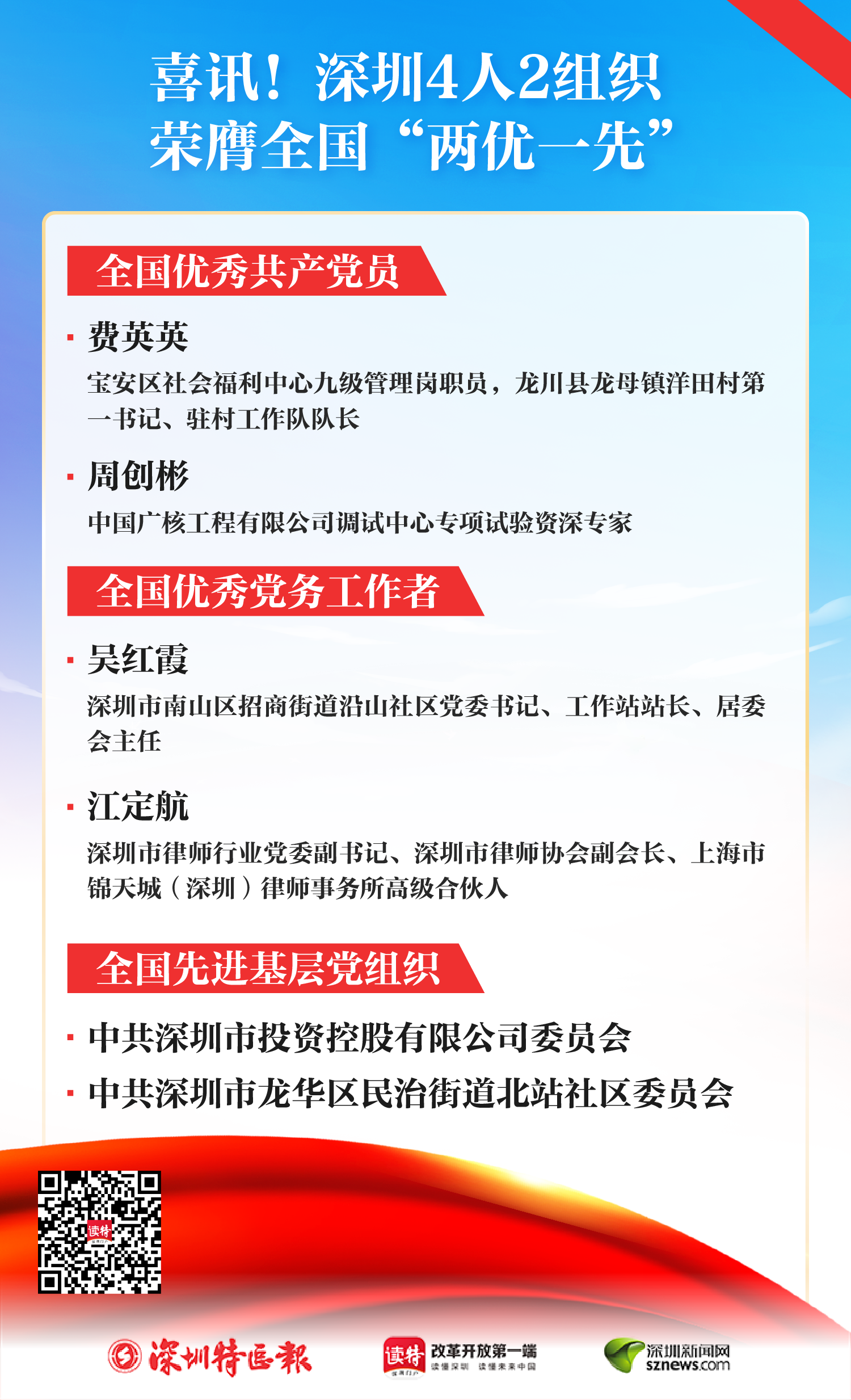 (原标题《喜讯!深圳4人2组织获评全国“两优一先”》)