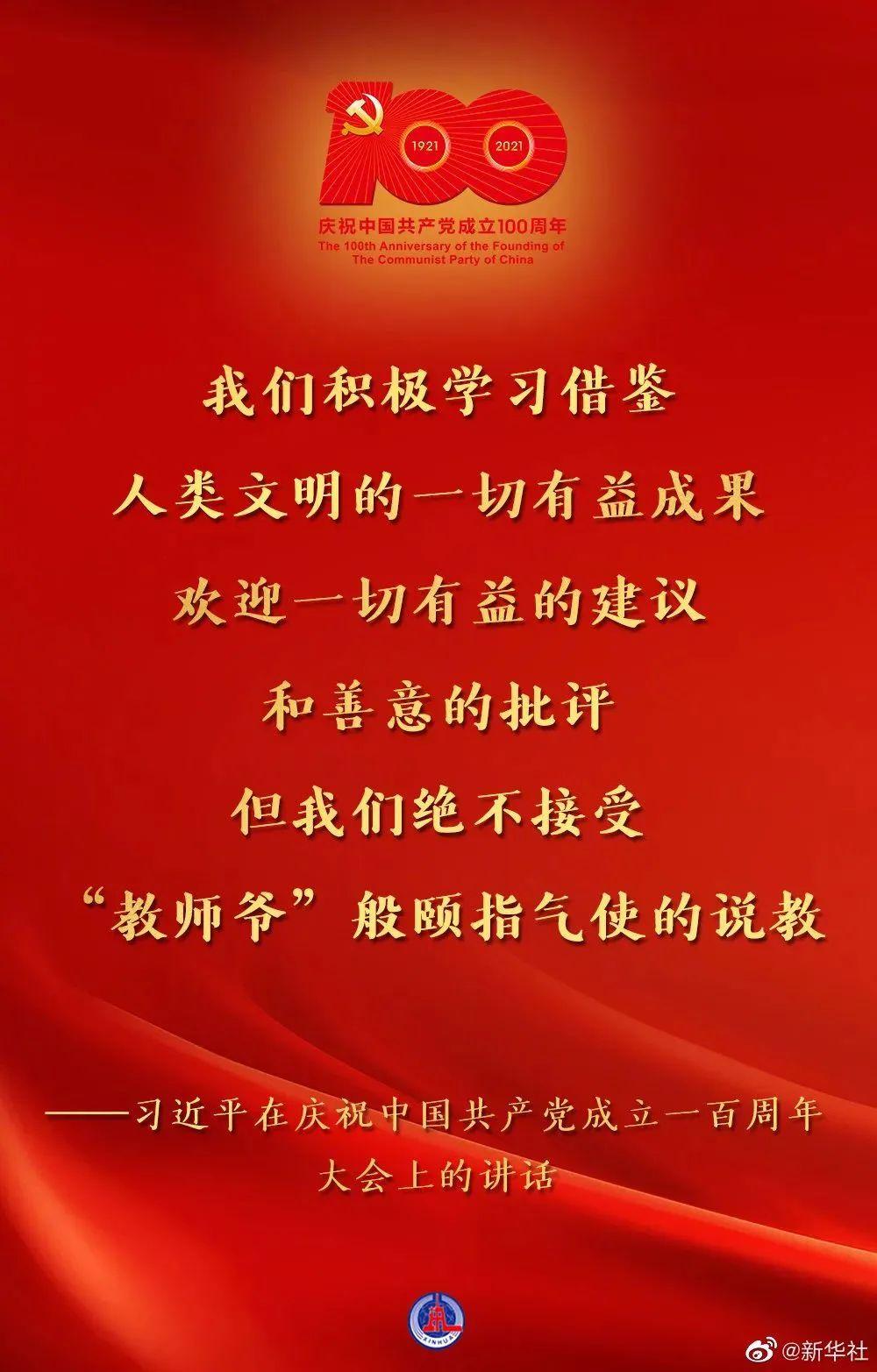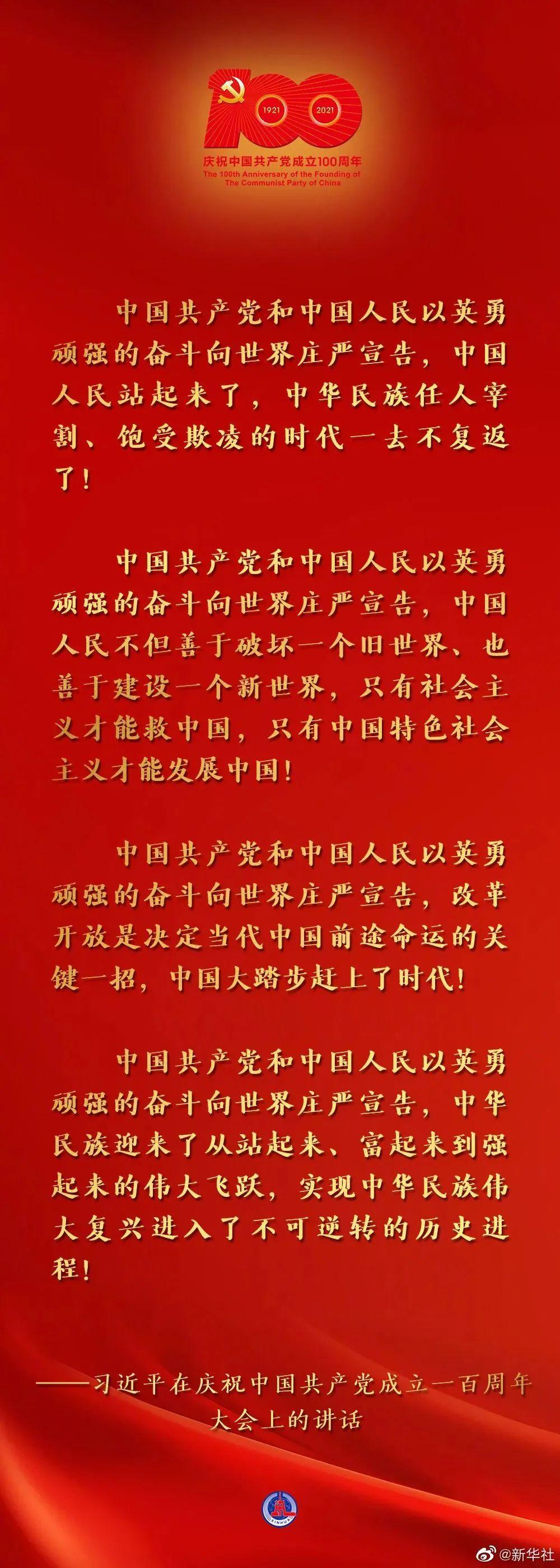 7月1日上午,庆祝中国共产党成立100周年大会在北京天安门广场隆重举行。中共中央总书记、国家主席、中央军委主席习近平发表重要讲话。
