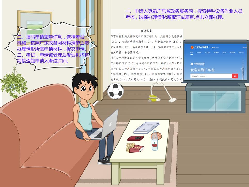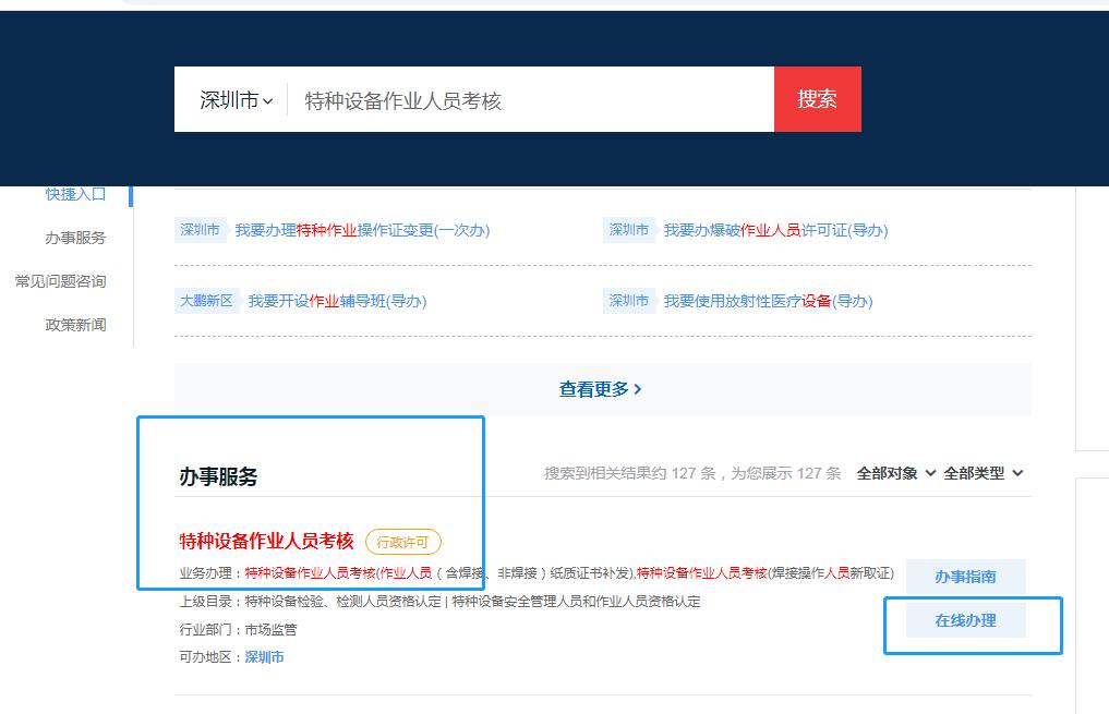 申请人登录“广东省政务服务网”(用户账号等级为L2级),搜索“特种设备作业人员考核”,办事站点选择“深圳市”,办理情形选择“特种设备作业人员考核新取证(或复审)”等,点击“立即办理”。