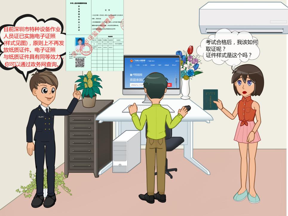 申请人考试合格的,一般3个工作日后可登录广东政务服务网,进入深圳市“特种设备作业人员考核”事项,在“我的证照”里查看特种设备作业人员电子证书。