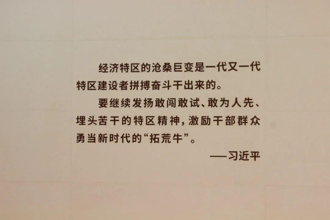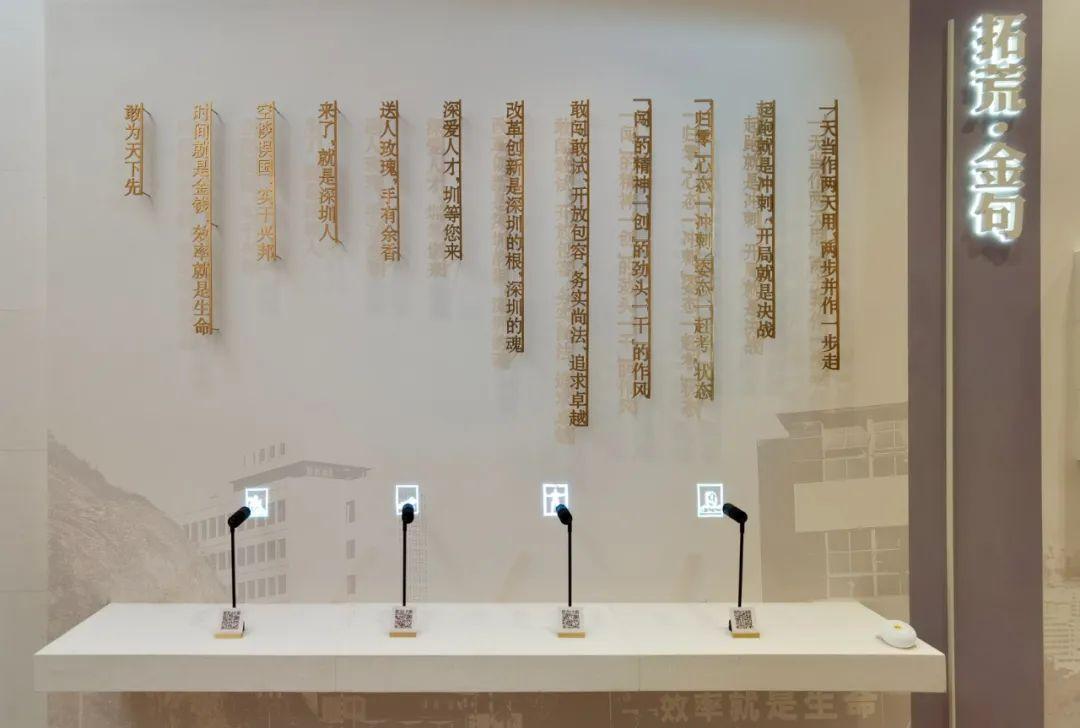展馆收集了特区“拓荒”过程中脍炙人口、响彻海内外、影响整个时代的100句金句,并将其中最具代表性的中12条金句集中展示在“拓荒·金句”板块。比如“时间就是金钱,效率就是生命”“敢为天下先”“深爱人才,圳等您来”“‘闯’的精神,‘创’的劲头,‘干’的作风”,它们都是深圳的城市符号和标记。