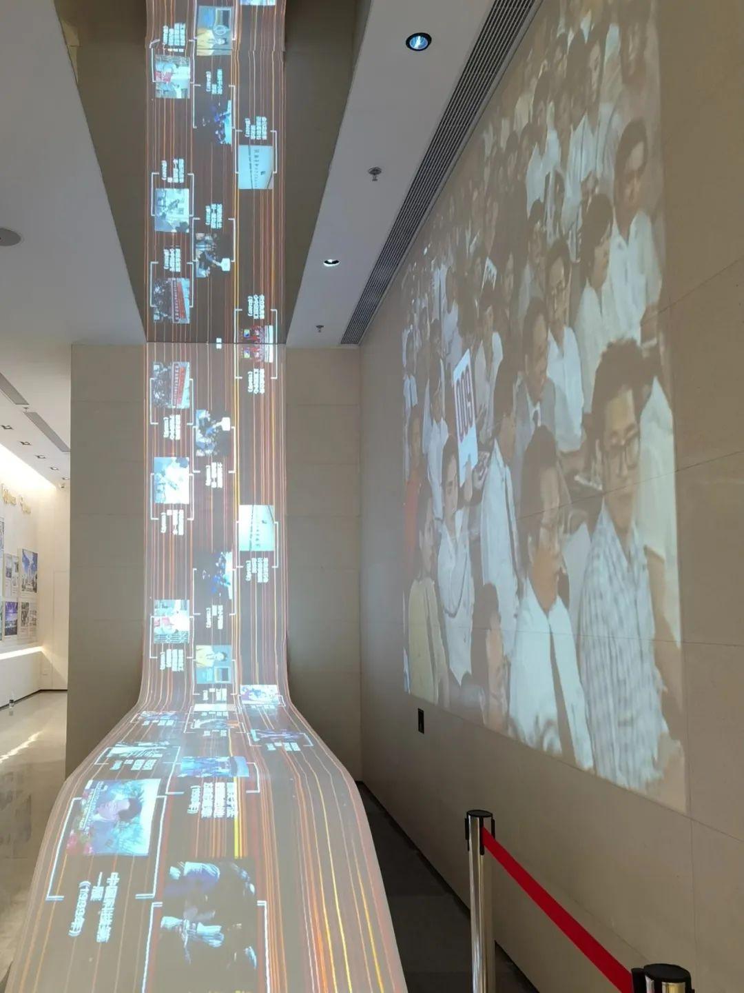 展馆内有一条流线型数字多媒体造型屏,寓意“时间·长河”,如珠江潮水般滔滔不绝、源源不断流动演绎。屏幕同时也是一个互动桌面,展示了100个小视频,点击视频后墙上的大屏幕便会自动播放该影片内容,从视觉、听觉等多位面展示深圳的拓荒精神。