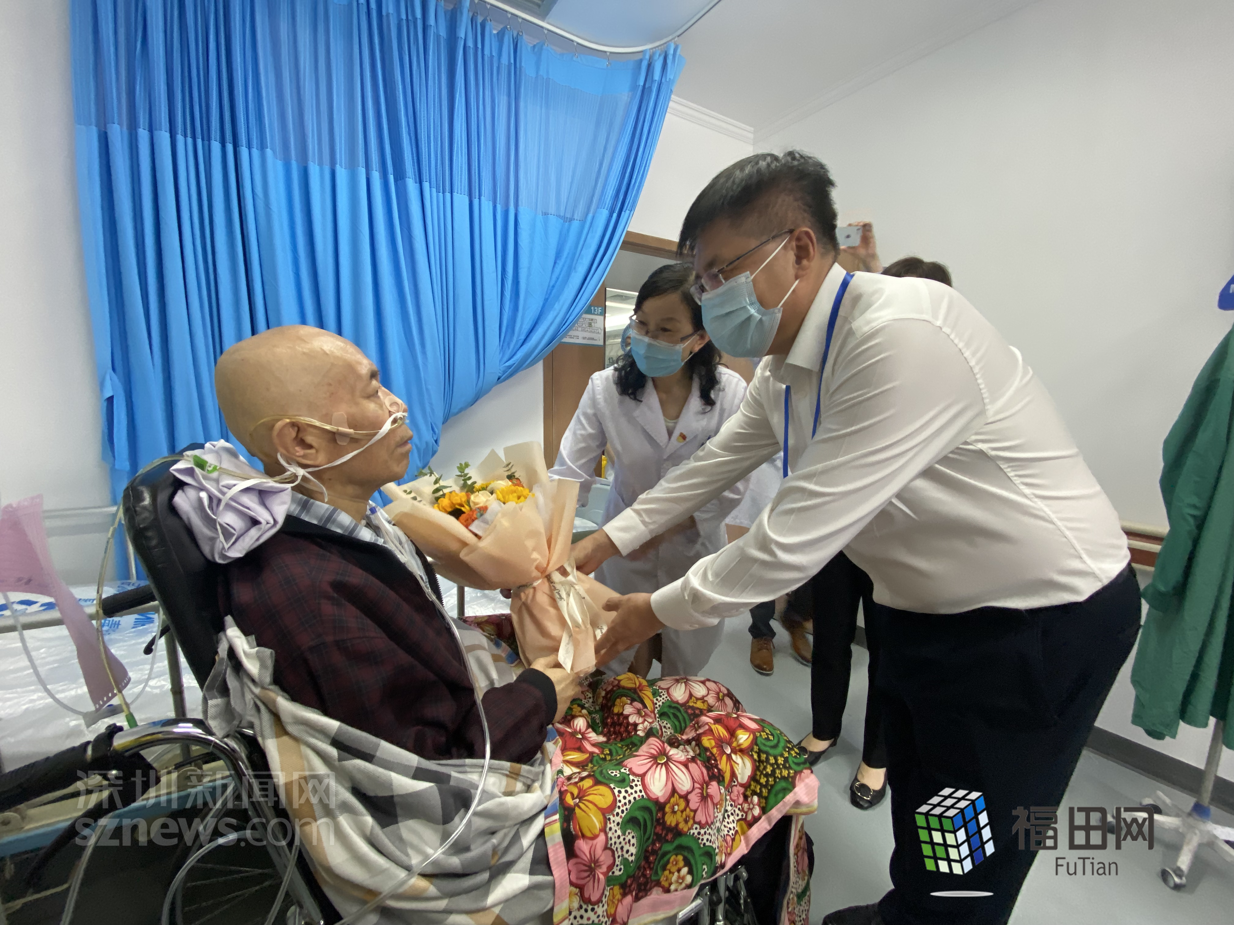 医院党委书记张天奉看望入党刚满50周年的患者唐先生。