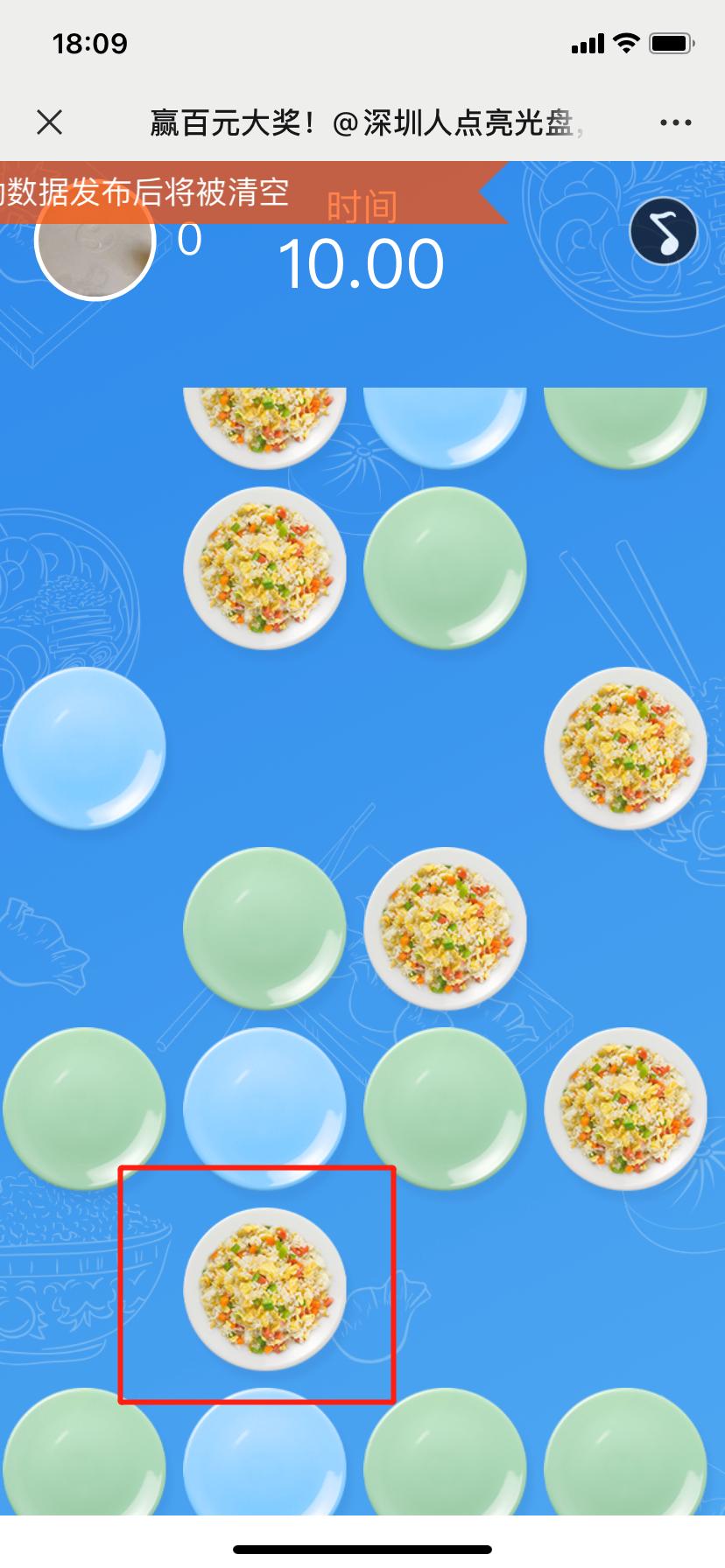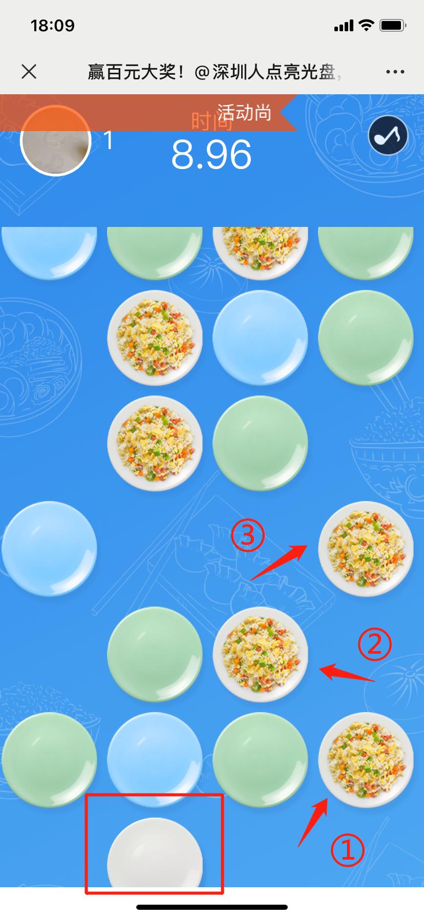 3.游戏开始后,在10秒内按照光标提示由下至上点击装满食物的白盘子,“光盘”后即可获取分数参与抽奖,注意不要点到其他颜色的盘子和空白处。