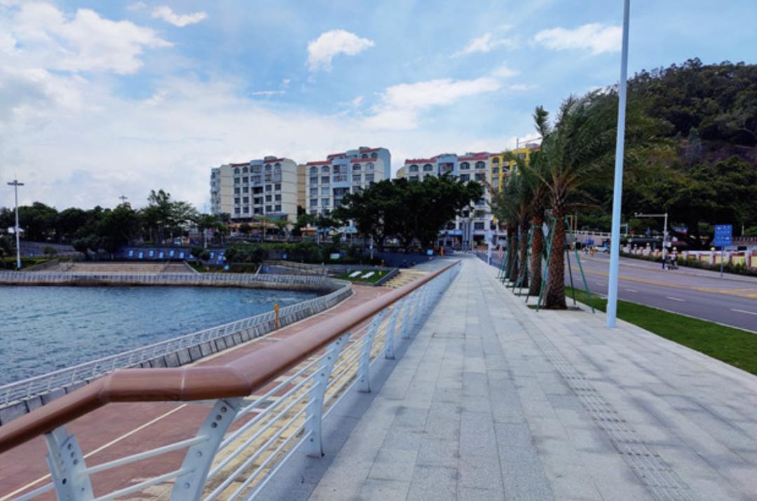 走入海港路,映入眼帘是视野开阔的海滨步道,亲近大海的白色护栏美观大方,极具滨海特色的中东海枣树分布有序,脚下是波浪形铺装的灰白渐变花岗岩,不远处还有充满滨海风情的镂空式观赏亭,观赏台设置有夜景灯光。海滨步道还新增了下行楼梯,经月亮湾畔观海栈道直通月亮湾广场,7公里“最美落日栈道”连通性大大提升。“