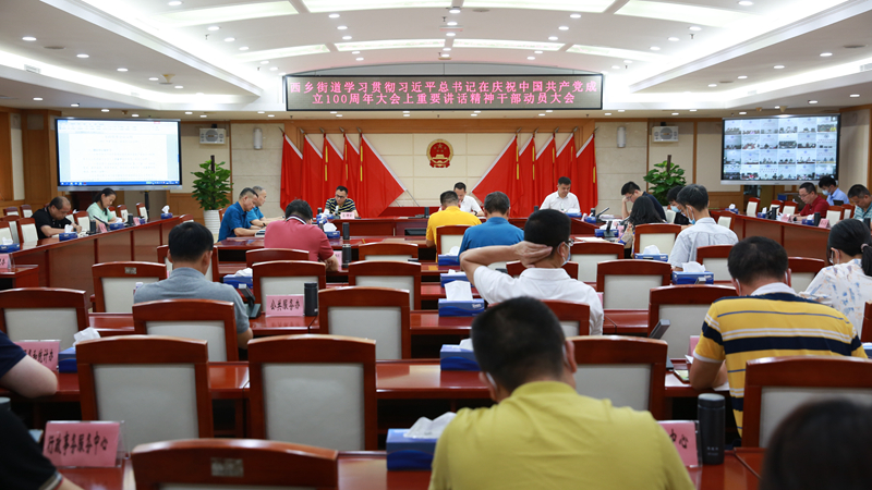 读特客户端·深圳新闻网2021年7月7日讯(记者 贺靛婧 通讯员 刘杰 彭赐该)7月5日,西乡街道召开学习贯彻习近平总书记在庆祝中国共产党成立100周年大会上重要讲话精神干部动员大会(视频会议),专题传达学习习近平总书记在庆祝中国共产党成立100周年大会上的重要讲话精神,以及省、市、区干部动员大会有关精神,研究部署贯彻落实措施。街道领导班子成员、处级非领导处级干部在主会场参加会议,各社区党委书记、一、二级股份公司董事长在各社区微中心分会场参加会议。