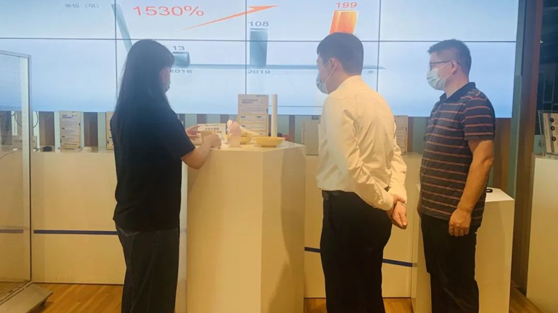 调研中,一行人来到粤港澳青年创新创业工场,与相关人员进行深入交流,调研资城创业工场孵化成果以及在粤港澳创客人才的引进与培养方面的经验,并参观了可取代塑胶无毒环保新材料、无创血糖智能穿戴设备等企业创新成果。
