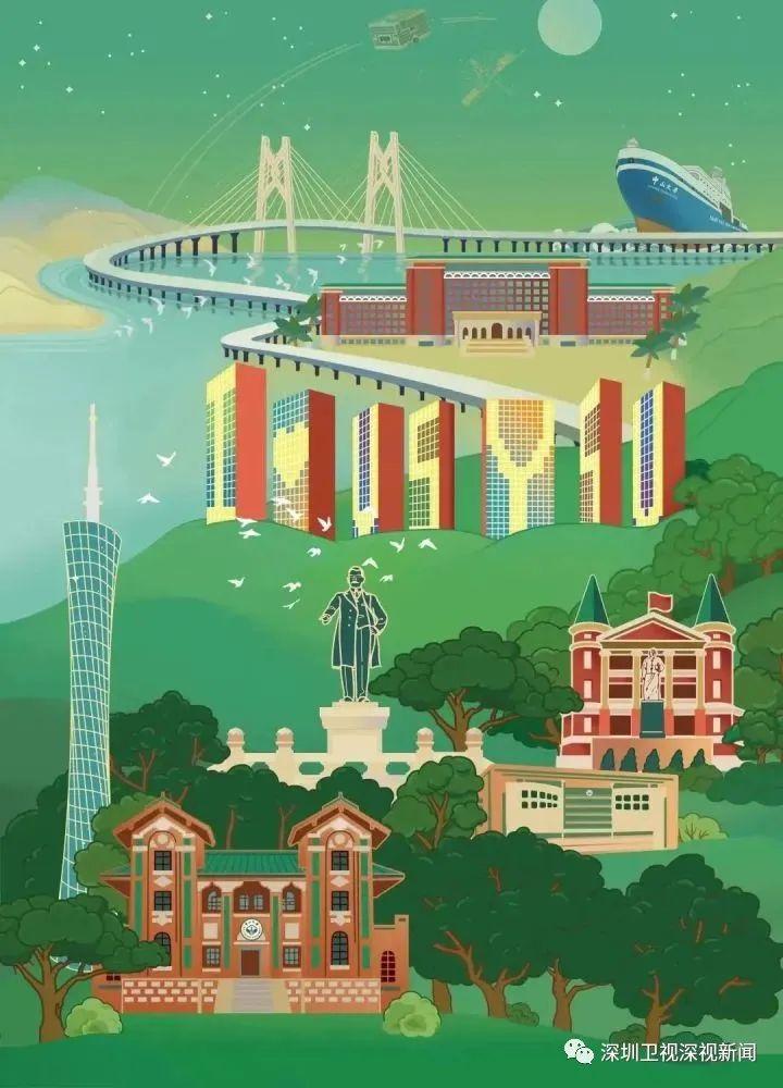 开启这份通知书,插画中展示的是中山大学地处粤港澳大湾区三座核心城市的“三校区五校园”办学格局。这其中,深圳校区的特色建筑占了C位。